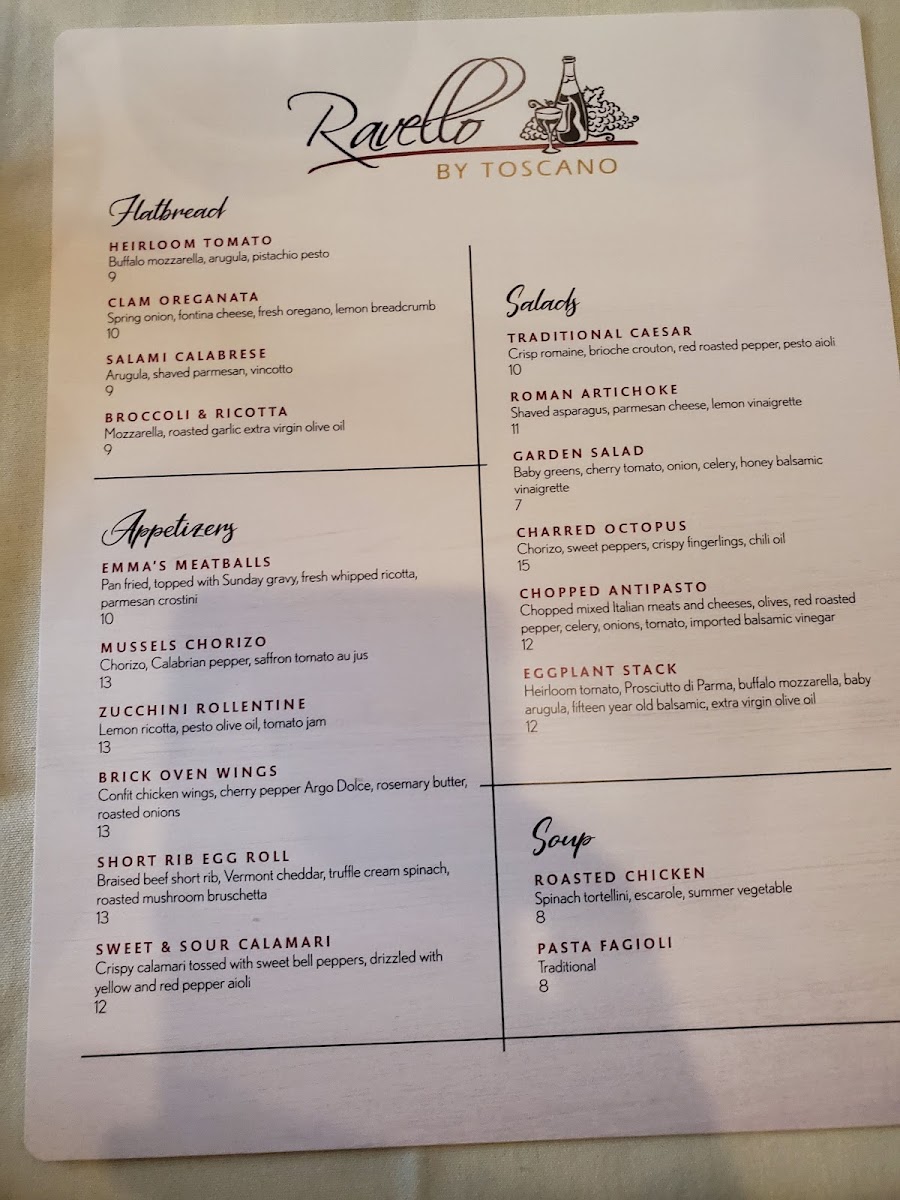 When you visit Ravello By Toscano, you're in for a treat with a menu that combines the best of traditional Italian flavors and modern twists. Whether you're craving a rich pasta dish, a flavorful pizza, or something from the sea, there's something for every taste. The Ravello By Toscano Menu offers a variety of mouthwatering options, from classic favorites to innovative creations. Each dish is crafted with fresh, high-quality ingredients, promising an authentic dining experience. The warm, welcoming atmosphere of the restaurant pairs perfectly with the exceptional food, making it a great spot for both casual meals and special occasions. Whatever you choose, you’re guaranteed to enjoy a meal that’s full of flavor and made with care.